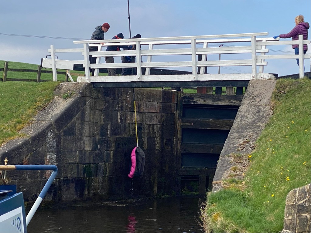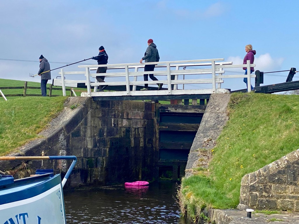 Then, we spotted something pink floating in the water near to the lock gate. The other boat had two dogs on it, and their bed had blown off the roof of the boat in the wind.